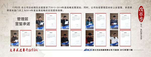 蛇年將逝,馬年將臨。2013年11月2日,浙江漢達(dá)機(jī)械有限公司的年度戰(zhàn)略會(huì)議拉開了帷幕。公司總經(jīng)理斗志激昂,領(lǐng)銜宣讀了2014年年度戰(zhàn)略發(fā)展規(guī)劃。公司的經(jīng)理、車間主任、主管等各級(jí)領(lǐng)導(dǎo)們紛紛跟起簽名宣誓。